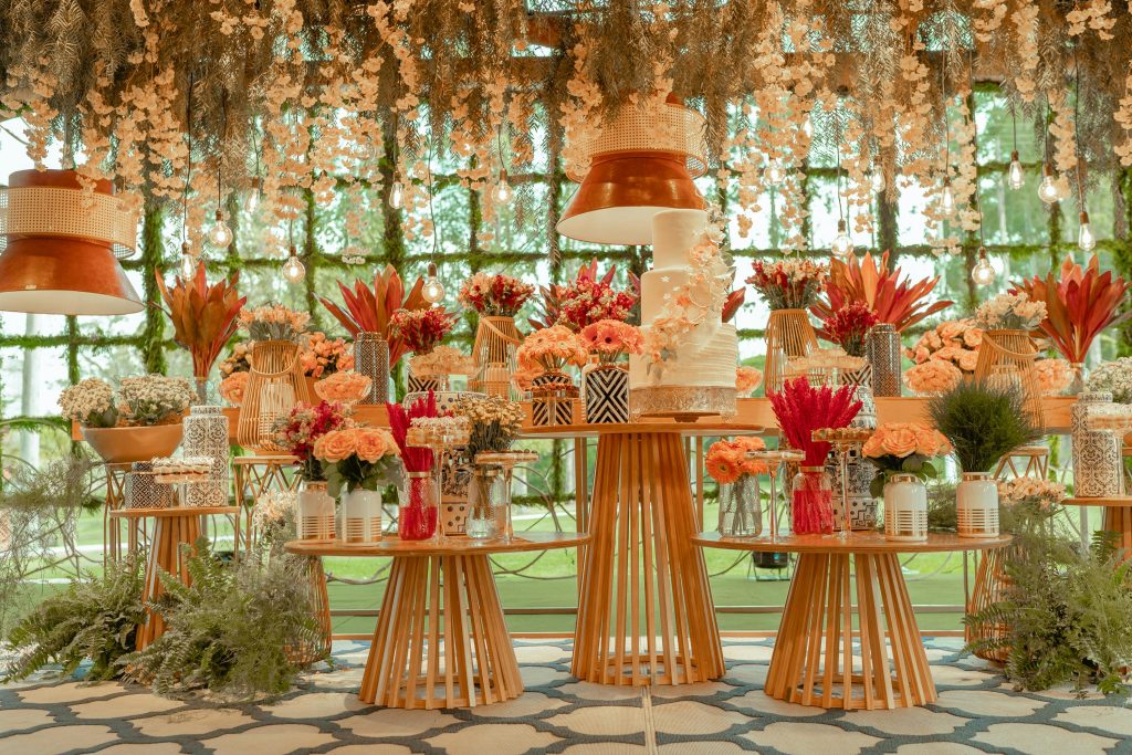 Já as mesas redondas de madeira, com cerca de 1,20m de diâmetro, são perfeitas para ilhas de decoração ou centros de destaque, criando um ar mais intimista e aconchegante, especialmente em eventos com menos convidados ou para compor arranjos florais e sobremesas. Importante lembrar que a madeira pode ser natural, envernizada ou pintada, e combina perfeitamente com toalhas de renda, jogos americanos de palha, flores do campo e louças artesanais.