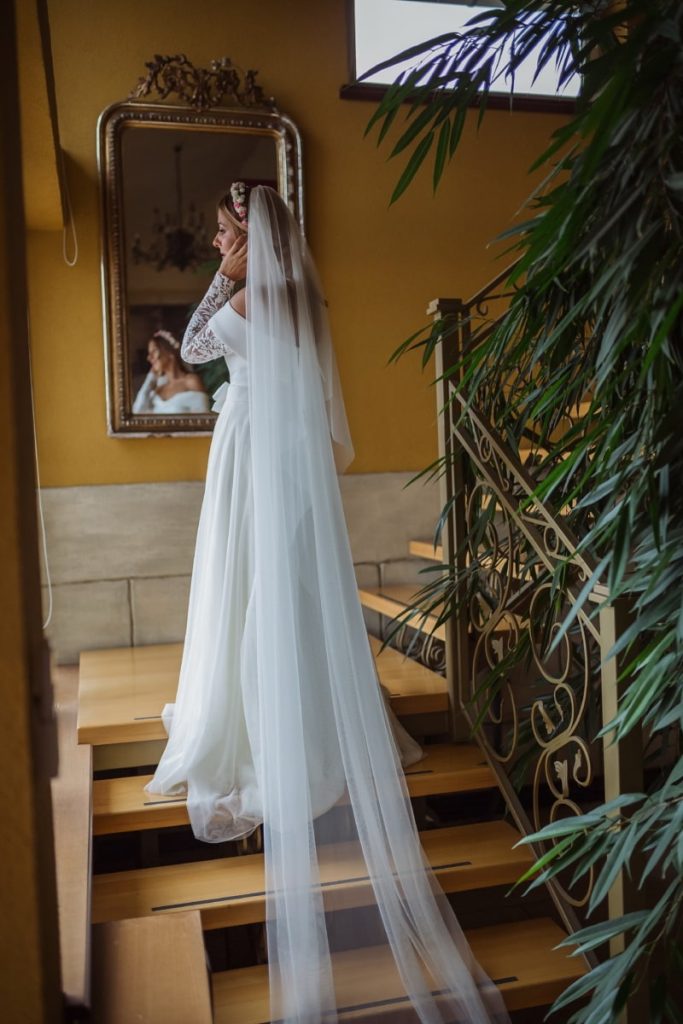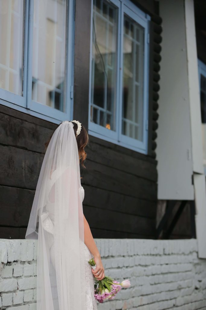 O véu é um dos símbolos mais antigos e emocionantes do casamento, tradicionalmente, ele representa pureza, mistério e o momento especial da revelação da noiva. Pode ser curto (tipo mantilha), médio (na altura dos ombros ou cotovelos) ou longo (arrastando pelo chão), e cada comprimento transmite um efeito diferente. O véu entra em cena principalmente na cerimônia, muitas vezes sendo levantado pelo pai ou pelo noivo, criando um instante de pura emoção. Além do simbolismo, ele também ajuda a compor o visual de forma suave, valorizando o vestido sem competir com ele.